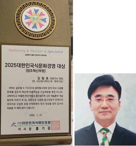 ±èöȣ (À¯)³»°íÇ⾾Ǫµå¡¤¢ß°è°î°¡µç ´ëÇ¥ÀÌ»ç ȸÀåÀÌ (»ç)´ëÇѹα¹½Ä¾ÖÀÎÆ÷·³(ÀÌ»çÀå È«±â¿î)¿¡¼ ¼±Á¤ÇØ ½Ã»óÇÏ´Â ¡®2025 ´ëÇѹα¹½Ä¹®È°æ¿µ ´ë»ó¡¯À» ¼ö»óÇÏ´Â ¿µ¿¹¸¦ ¾È¾Ò´Ù.